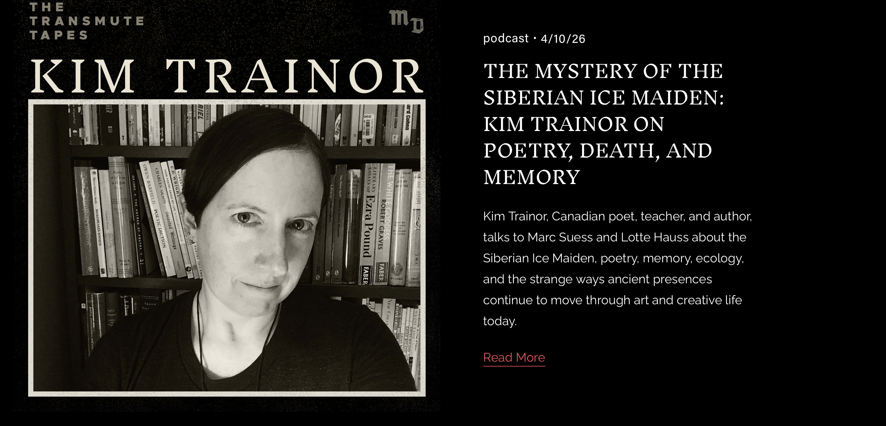 Delighted to share this podcast with Maison Douce, on the subject of my second book, Ledi, on the Siberian Ice Maiden: “For this episode of The Transmute Tapes, we speak with Kim Trainor — a Canadian poet, teacher, and author based in Vancouver, whose work moves between poetry, ecology, memory, grief, and the ethics of attention. Trainor is the author of several books, including Ledi (2018), a book-length poem shaped around the excavation of the Siberian Ice Maiden, and her most recent book, Blue thinks itself within me: Lyric poetry, ecology, and lichenous form, published in February 2026. Her website also describes her earlier 2024 poetry collection A blueprint for survival, which traces wildfire, climate crisis, and forms of resilience.