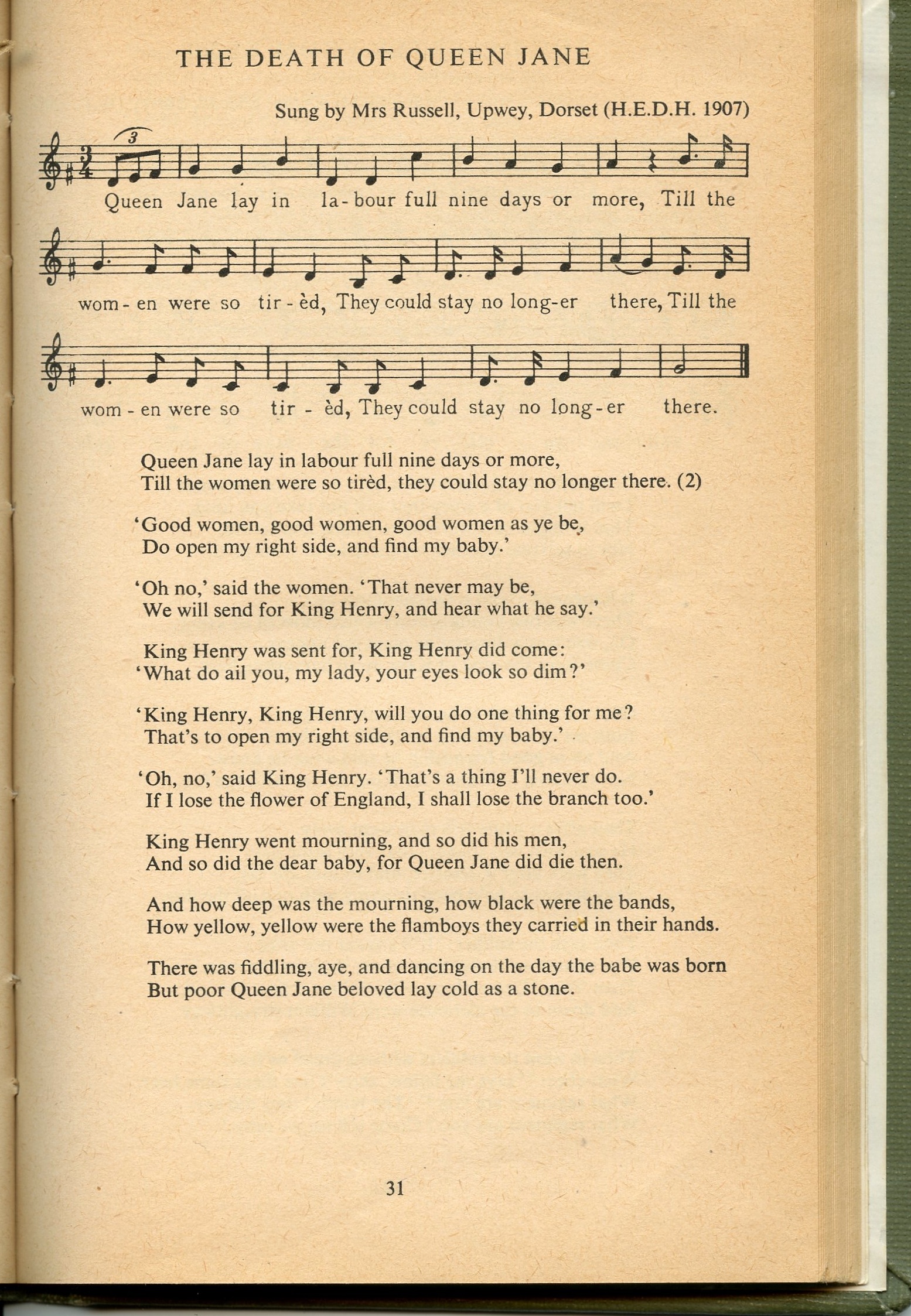 Their note to this ballad goes: “The story is a legendary re-working of historical fact. Jane Seymour, wife of Henry VIII, died on 24 October 1537, twelve days after the natural birth of her son, who later became Edward VI. Some said her death was due to clumsy surgery. We do not know how old this ballad is, nor if it derives from a piece called The Lamentation of Queen Jane, licensed for publication in 1560. The ballad has been collected in Devon (FSJ II 222) and Somerset (FSJ V 257), and a second Dorset version is given in FSJ III p.67. The Death of Queen Jane is No. 170 in Child’s collection.” p.113.